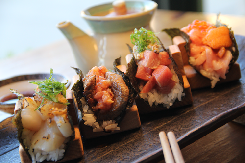 2 Namasake Nigiri with Ginger Soy Sauce / 2 Hamachi Nigiri with Jalapeño Soy Sauce / 2 Bluefin Akami Nigiri with torch spicy Lava Sauce and Scallions (Contained Sesame).